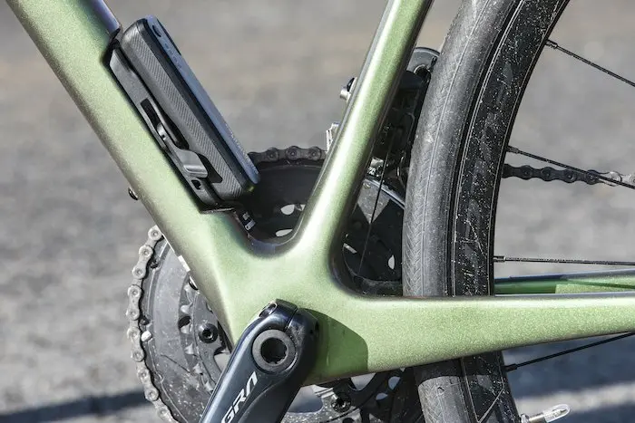 Ce même capteur communique avec l’application et permet de suivre les intervalles de maintenance du vélo. L’ensemble du système est composé du Radar Garmin Varia, qui recherche en permanence les véhicules qui suivent le cycliste et qui les signale à partir d’alertes sonores et visuelles sur l’unité d’affichage du vélo, un compteur GPS ou l’application, de feux de jour Lezyne avant et arrière (avec une fonction d’alerte de freinage en option) qui s’adaptent à la luminosité ambiante, et d’une seule et unique batterie pour tout le système, et qui peut être également utilisée comme source de charge USB-C lorsqu’elle est démontée du support sur le vélo.
