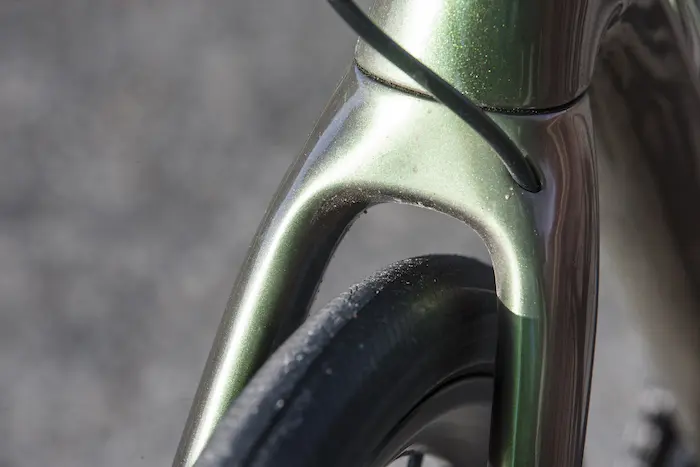 Ce nouveau Synapse se voit équipé de tubes relativement fins et aux formes relativement classiques. Le sloping (plus marqué dans cette petite taille 48 pour le vélo de test) est dans l’air du temps, de même que l’implantation des haubans à l’arrière, quelques centimètres sous le serrage de selle. Des haubans qui bénéficient d’une peinture réfléchissante, dans le même esprit que l’éclairage monté sur le vélo. Les dimensions des tubes sont différentes d’une taille de cadre à l’autre, afin d’assurer un comportement identique du vélo pour tous les utilisateurs, mais aussi une absorption équivalente des vibrations au niveau de la fourche ou du triangle arrière.