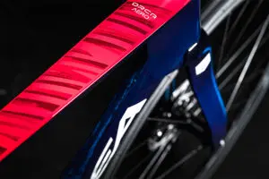 Les couleurs de l’équipe Ceratizit – WNT Pro Cycling sont composées d’une finition en carbone apparent accompagné d’un vernis bleu et de détails rouges et bleus sur le cadre. Une esthétique spectaculaire et unique dans le peloton, qui économise de plus des dizaines de grammes par rapport aux autres peintures.