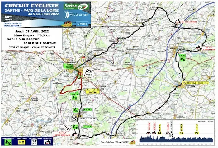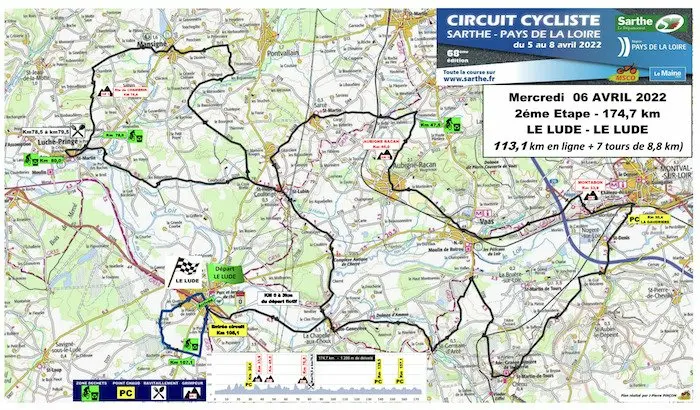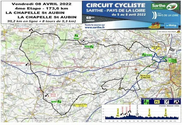 Après deux années d’absence à cause de la pandémie de Covid-19, le circuit cycliste Sarthe – Pays de la Loire 2022 se déroulera du 5 avril au 8 avril avec quatre étapes intégralement disputées dans le département de la Sarthe. Et pour un retour, l’épreuve ligérienne s’offre un plateau de choix, avec Mark Cavendish, Mads Pedersen Filippo Ganna, Thibaut Pinot, et sans doute même Peter Sagan (à confirmer). Retrouvez le détail du parcours des quatre étapes et les horaires.
