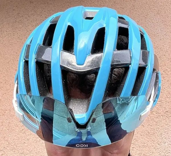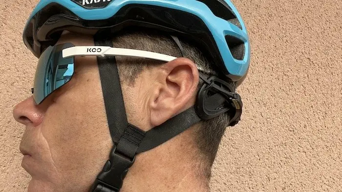 Car cette conception minimaliste s’accompagne d’une tenue qui n’est pas assez ferme à notre goût, que ce soit sur le casque en glissant les branches dans les trous d’aération, ou sur le visage quand on a un visage assez fin. Les embouts de branches sont bien équipés d’une matière antidérapante, mais les Supernova semblent tout de même un peu flotter sur le nez, surtout lorsqu’on baisse la tête en roulant pour vérifier le développement utilisé sur le vélo par exemple. Enfin, même associées à un Kask, nous trouvons les branches un peu trop longues, et elles entrent en conflit avec le système de rétention du casque.Les longues branches peuvent entrer en conflit avec le système de maintien du casque.