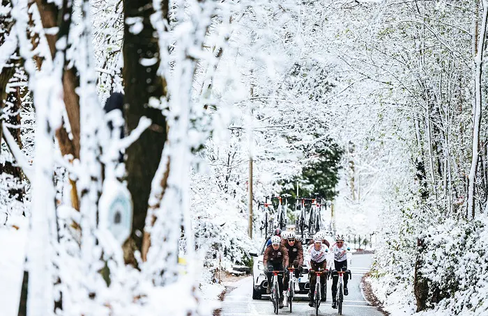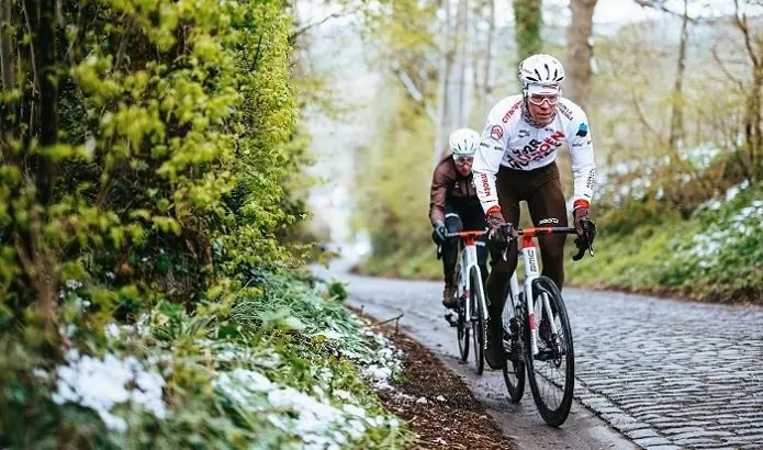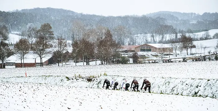 En tant qu’ambassadeur Sportful, Paolo Bettini dirige les opérations. S’il est depuis longtemps retiré des pelotons professionnels, ses souvenirs du secteur et sa passion pour les courses cyclistes sont restés intacts. Pourtant, ce vendredi matin, le moral est tombé dans les chaussettes. Il faut dire qu’une petite couche de neige a envahi le secteur. Autant dire que rouler sur les pavés dans ces conditions n’est pas raisonnable, même si quelques équipes dont AG2R Citroën ne dérogeront pas à la traditionnelle reconnaissance, ce qui donnera lieu à quelques photos mémorables, surtout pour un mois d’avril. De façon plus raisonnable… nous attendons.