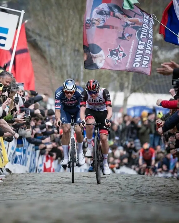 Installés au sommet du Paterberg, nous avons eu la chance d’avoir une triple ration de spectacle car d’une part, le circuit final incluant aussi le Vieux Kwaremont définit deux passages lors des 40 derniers kilomètres (chez les hommes) et d’autre part, ce ruban pavé est aussi emprunté par les femmes, une seule fois en ce qui les concerne. Sans compter que les écrans géants permettaient de ne pas rater une miette des attaques de Tadej Pogacar ou du courage de Valentin Madouas. Sur ce nouveau schéma de course, le deuxième passage donne une idée assez précise du classement tel qu’il sera à l’arrivée, même si la configuration de la course 2022 indécise jusqu’aux derniers mètres, a pu faire mentir la tradition.
