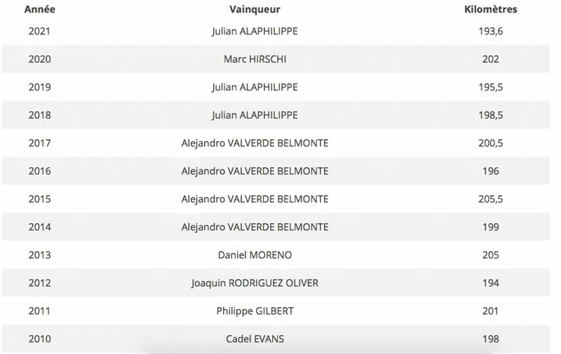 Les vainqueurs de la Flèche Wallonne depuis 2010