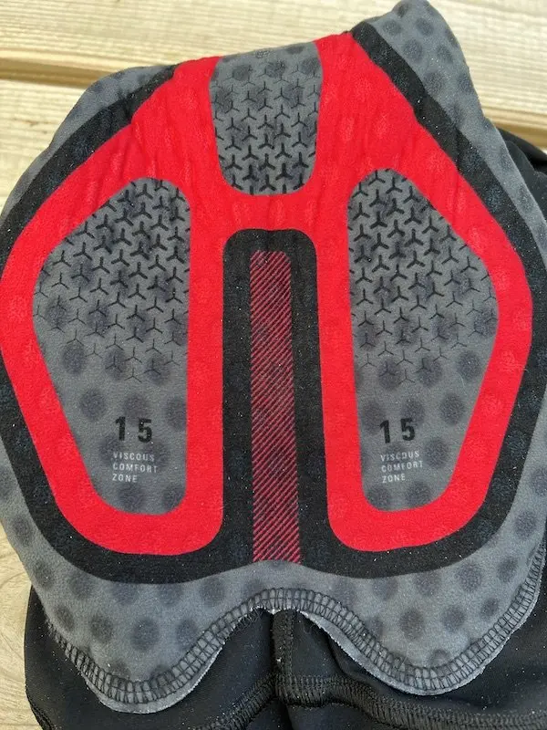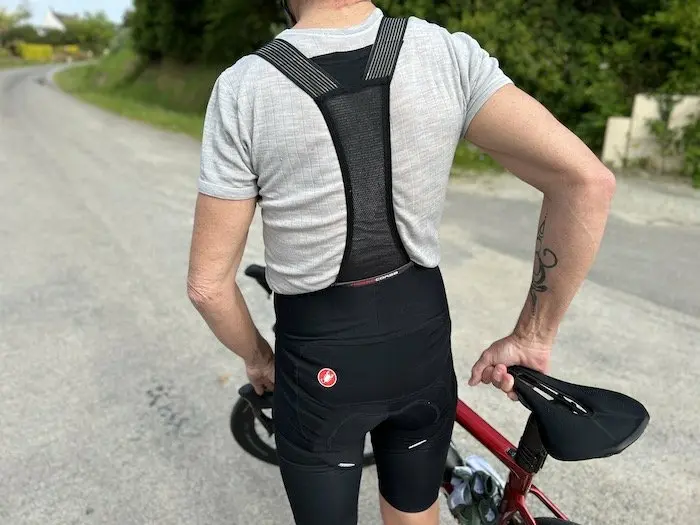 Reste qu’au moment d’enfiler le cuissard, on ressent bien l’ADN course du modèle avec une forte impression de maintien et une légère compression, au niveau des cuisses et des hanches. Au premier abord, les matériaux semblent plus fermes et plus épais que la plupart des cuissards du marché. Néanmoins, le confort des bretelles plates et fines est d’emblée appréciable, notamment en superposition sur un sous-vêtement. Le cuissard prend rapidement sa place, et ne semble pas faire de plis. Il est relativement long au niveau des cuisses, ce qui reste déstabilisant quand on ne dispose pas de jambes très longues. Il vient se placer pour nous juste au dessus des genoux, et pour le positionner légèrement au-dessus comme habituellement, il faut seulement compter sur la rigidité relative du tissu, puisqu’on ne trouve pas d’élastique ou de bande adhérente pour le maintenir à la place voulue.