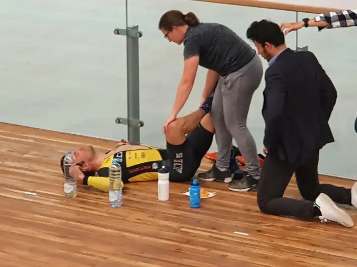 Après des mois de préparation et d’attente, le jour J est enfin arrivé. Vincent ne veut pas avoir de regrets et part sur la base de son tableau de marche le plus optimiste, 2h10, soit 19’’5 au tour (46,1 km/h de moyenne) avec un braquet de 58×16 (7,56 m par tour de pédale). Pendant 30 km tout se passe bien et le tableau de marche est respecté. Mais à 270 tours de l’arrivée, Vincent commence à sentir une inflammation du nerf sciatique avec des spasmes dans l’ischio gauche, et à perdre de la sensibilité dans les orteils.