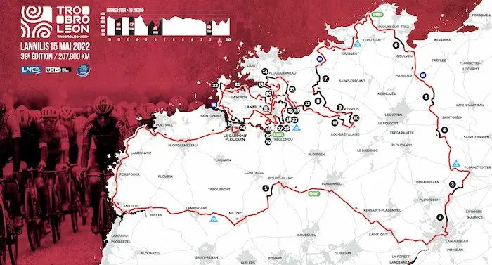 La 38e édition du Tro Bro Leon se déroule le dimanche 15 mai 2022, avec au programme 207,8 km et 29 ribins de terre. 22 équipes se présentent au départ, dont six World Team, de « l’Enfer de l’Ouest », neuvième manche de la Coupe de France. Parmi les favoris, on retrouve Connor Swift (Arkea Samsic), le vainqueur sortant, mais aussi ses co-équipiers Hofstetter ou Capiot, Turgis, Terpstra ou Simon chez TotalEnergies, Petit (Intermarché – Wanty – Gobert), Polanc (UAE Team Emirates) ou Stewart (Groupama – FDJ). Retrouvez le parcours, les horaires de diffusion TV et les engagés du Tro Bro Leon 2022.