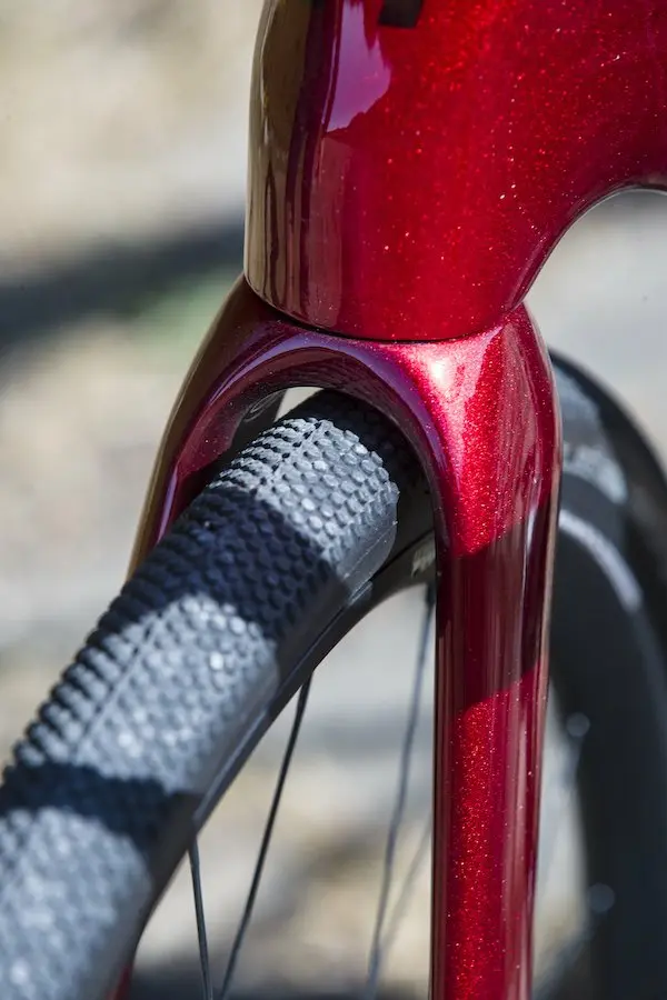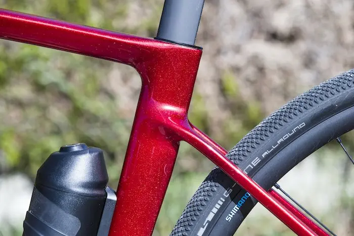 Le vélo ne cache pas ses origines de vélo de route, avec un dégagement qui reste relativement réduit entre les pneus de 35 mm de section et les tubes et la fourche. Il est difficile d’imaginer pouvoir monter une section plus importante, qui aurait pour avantage d’autoriser un léger sous-gonflage pour les chemins les plus cassants. Les Schwalbe G-One sont de bons pneumatiques, qui offrent du rendement sur les pistes roulantes, et une adhérence correcte sur terrain humide, à la condition d’éviter les conditions vraiment boueuses. Mais dès la première sortie, nous avons enchainé trois crevaisons, dont deux par pincement, puisque le vélo est monté avec des chambres à air. Un gonflage assez ferme est donc indispensable pour éviter ce genre de désagrément, mais avec une perte sensible en confort sur les chemins cabossés et déjà asséchés en ce début de printemps.