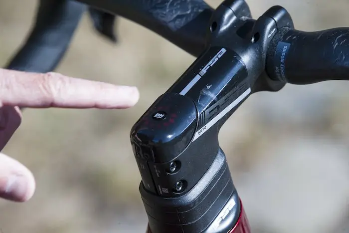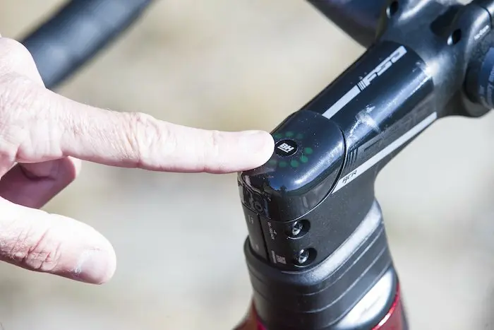 Pour ces voyants de modes d’assistance électrique, BH a fait le choix d’un système minimaliste intégré à la potence. On passe d’un mode d’assistance à un autre par une simple impulsion sur le sommet de la potence, avec les codes couleurs suivants : blanc (système sous tension, mais sans assistance), vert (niveau 1), bleu (niveau 2), orange (niveau 3), rouge (niveau maximum). Pour diminuer le niveau d’assistance, il suffit d’appuyer deux fois de suite sur le bouton. Une manipulation qui implique de lâcher une main du cintre, et qui n’est pas toujours pratique sur les parcours les plus accidentés. Reconnaissons toutefois que le système est fort élégant.