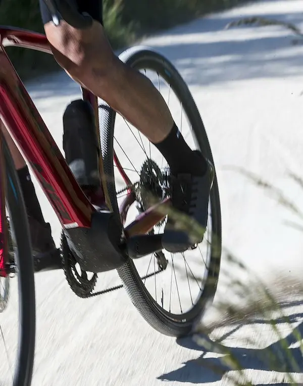 Le poids constaté du vélo tranche avec ses lignes épurées, et ses gros pneus contrastent avec des tubes aérodynamiques qui inspirent plutôt la vitesse. Mais ce sont des pneus qui se montrent toutefois insuffisants pour faire du BH Core GravelX un véritable vélo tout-terrain. S’il s’en sort très honorablement sur les pistes de gravel bien tassées, les incursions en sous-bois sont plus problématiques, notamment en raison du manque d’absorption des chocs et vibrations. Un caractère qui devient vite désagréable lorsque le terrain est très sec ou sur des singletracks avec de nombreuses racines.
