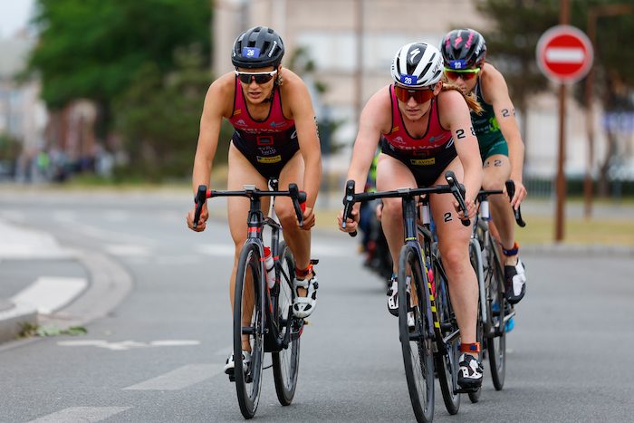 A l’issue de la natation, les fortunes des deux favorites sont diverses. Tandis que Pierre Le Corre s’acquitte parfaitement de sa tâche en sortant en 4e position de l’eau tout près de Matthew Hauser (Triathlon Club de Liévin), Valentin Morlec (Metz Triathlon) et Nathan Lessmann, Hayden Wilde est pointé en 28e position à 25 secondes de la tête. Cette performance l’empêche d’intégrer le groupe de 12 échappés qui se constitue dès les premiers kilomètres à vélo. Outre Hauser, Morlec et Lessmann, figurent parmi les fuyards Baptiste Passemard (Tri Val de Gray), Paul Lebois (Saint-Jean-de-Monts Vendée Triathlon), Casimir Moine (Metz Triathlon), Jawad Abdelmoula et Antoine Duval (Poissy Triathlon), Jérémy Quindos (Montpellier Triathlon), Brandon Copeland et Hugo Winock (Triathlon Club Liévin).