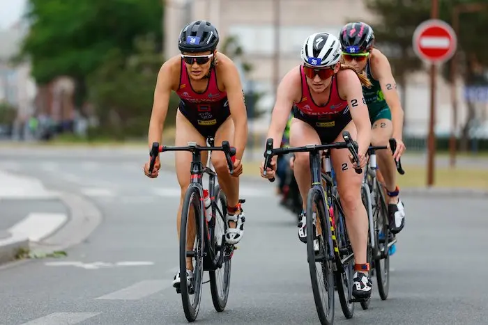A l’issue de la natation, les fortunes des deux favorites sont diverses. Tandis que Pierre Le Corre s’acquitte parfaitement de sa tâche en sortant en 4e position de l’eau tout près de Matthew Hauser (Triathlon Club de Liévin), Valentin Morlec (Metz Triathlon) et Nathan Lessmann, Hayden Wilde est pointé en 28e position à 25 secondes de la tête. Cette performance l’empêche d’intégrer le groupe de 12 échappés qui se constitue dès les premiers kilomètres à vélo. Outre Hauser, Morlec et Lessmann, figurent parmi les fuyards Baptiste Passemard (Tri Val de Gray), Paul Lebois (Saint-Jean-de-Monts Vendée Triathlon), Casimir Moine (Metz Triathlon), Jawad Abdelmoula et Antoine Duval (Poissy Triathlon), Jérémy Quindos (Montpellier Triathlon), Brandon Copeland et Hugo Winock (Triathlon Club Liévin).