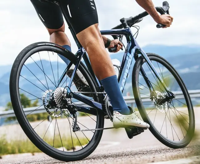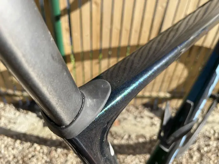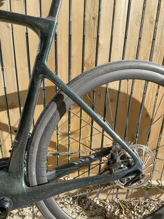 Nous avons donc apprécié le confort du cadre, à moyenne comme à haute vitesse, sur le plat comme en descente, bien aidé par les larges Tubuless Rubino Pro de 30 mm de section qui apportent eux-aussi beaucoup de confiance, notamment sur les prises d’angle, et de bien-être sur la route. La filtration des vibrations est efficace sur l’arrière du vélo et très bonne sur l’avant. On sent tout le travail d’absorption du triangle arrière et surtout des haubans sur les portions de routes abîmées. Cela « tape » légèrement plus sur l’avant, avec la prise en main du cintre profilé, sur sa partie haute en aile d’avion.