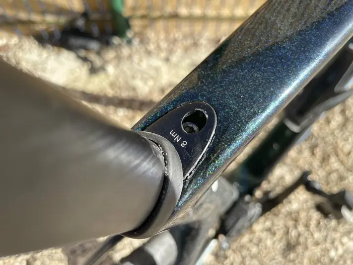 La patte de dérailleur avant boulonnée est fabriquée dans un alliage d’aluminium haute résistance et se fixe au cadre à l’aide de deux vis à tête fraisée. La remplacer est facile en cas de dommage, tout comme la retirer complètement pour l’installation d’un système monoplateau.