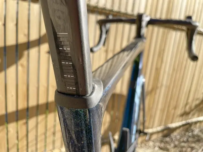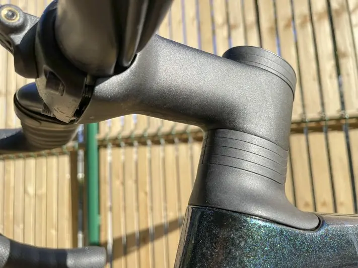 Autour du cadre, rien ne dépasse, du cockpit au dérailleur arrière. Le Caledonia-5, dans cette version test en Sram Rival eTap AXS, est totalement épuré avec une intégration complète, notamment des câbles, gaines et durites des freins à disque dans le poste de pilotage. Par souci de facilité d’entretien et donc de confort d’usage, celui-ci dispose d’un pivot de fourche en forme de « D » avec des bagues uniques pour accéder aux durites et câbles si besoin. Il est équipé d’entretoises spécifiques intégrées qui permettent de ne pas avoir à tout déconnecter pour régler la hauteur de la potence et facilitent l’adaptation du Stack en position « agressive ou détente » (de 580 à 687 mm) selon votre forme ou le type d’épreuve.