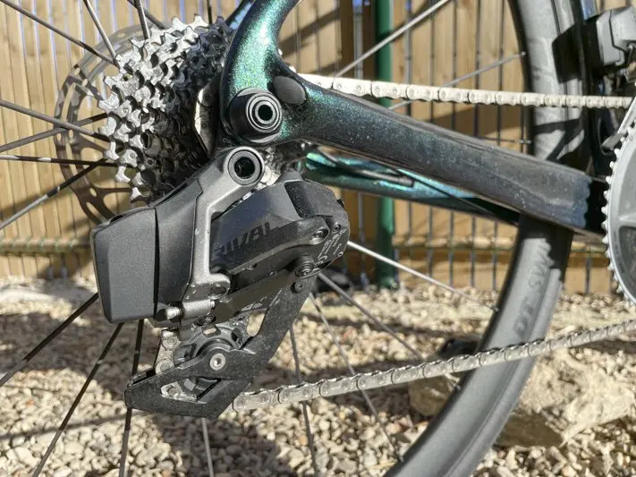 Au fil des kilomètres, le Cervélo Caledonia-5 laisse une impression de facilité et maniabilité. Dans notre version d’essai, il est soutenu par le très agréable groupe Sram Rival eTap AXS évoqué plus haut. La transmission électronique sans fil 12 vitesses de l’équipementier américain ne fait l’objet d’aucun reproche, que l’on parle des changements de rapports comme du freinage, à la fois mordant et silencieux.