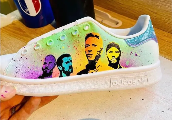 Vincent a toujours aimé dessiner et peindre depuis qu’il est ado puis progressivement, lui qui avait déjà graffé sur des gros blocs de béton anti-attentats, a récupéré cette technique du Spray Paint pour s’exprimer sur un format bien précis, les chaussures. Et plus précisément les chaussures de cyclistes. « J’aime retranscrire ce que je veux sur une paire de chaussures de cycliste, ça la rend complètement unique ». Le créateur ajoute : « Je suis de la génération qui a grandi avec l’évolution de la basket ». Il me présente alors une création sur une paire de Adidas Stan Smith sur le thème de Cold Play. Un travail quasi chirurgical qui demande beaucoup de technique et une patience, et absolument formidable.