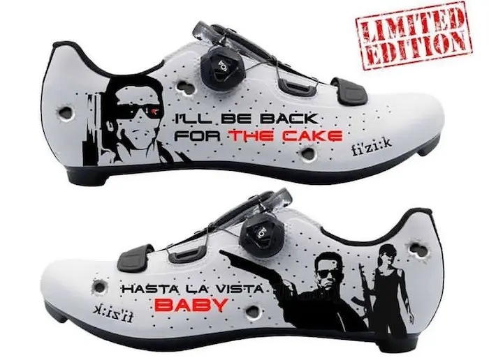 « Il ne faut pas se louper, j’anticipe comment je vais m’y prendre pour tel ou tel dessin, mais rien ne me fait peur ». C’est notamment le cas de cette paire entièrement customisée dans le projet Wonder Woman commandée par Christelle Ribault. Certains dessins prennent une journée entière à être réalisés. Mais la paire de chaussures qui nous a le plus marqués, ce sont des chaussures Fizik. En effet, à l’occasion du week-end French Artist, Vincent a proposé cette personnalisation unique à 120 € (hors prix des chaussures). Et visiblement, comme Vincent avait réussi à en personnaliser 10 de la même façon, beaucoup de clients se sont empressés de passer commande, pour arborer fièrement cette édition griffée Hasta la vista, Baby d’un côté et I’ll be back for the cake de l’autre.