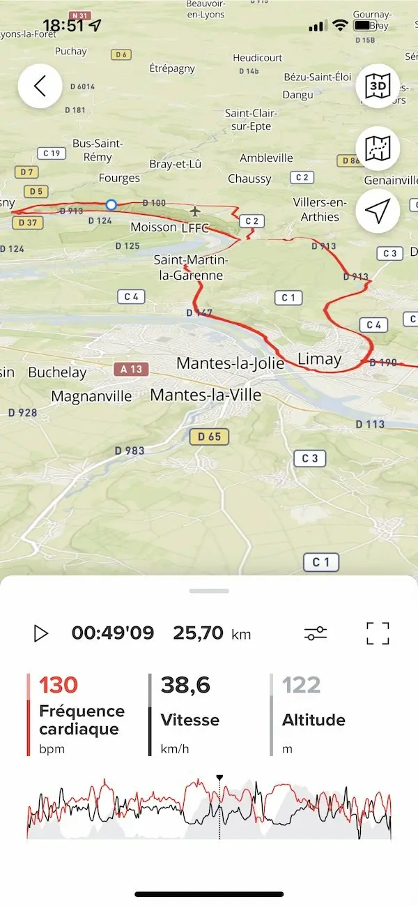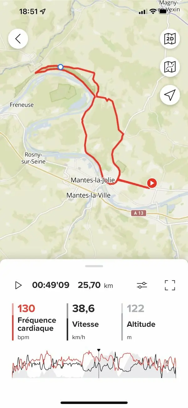 Reste que pour ce qui est des fonctions classiques qu’on attend d’un compteur GPS, nous ne sommes pas déçus. Sur la route, la vitesse et la distance sont précises et la trace GPS reprend fidèlement le parcours effectué. Concernant le calcul de la distance, nous avons constaté une différence de 60 mètres sur environ 47 km avec le Garmin Edge 820 connecté à Strava, ou encore 31 mètres sur 76 km sur une autre sortie. Dans le détail, en zoomant sur une partie de route où nous sommes passés deux fois (à l’aller et au retour d’une sortie), avec un arrêt à la station de lavage au retour, les deux traces sont très proches, et restent très performantes pour qui souhaite utiliser le GPS pour calculer une distance. Pour le dénivelé, c’est là encore une trentaine de mètres à chaque fois par rapport aux données Strava avec le Garmin, mais pour le coup le baromètre intégré de la Suunto semble plus réaliste dans le détail que celui du Garmin, dont on connait les faiblesses. Pour preuve, on note les mêmes dénivelés positifs et négatifs avec la Suunto, pour des points de départ et d’arrivée identiques. Enfin, pour ce qui est de l’affichage de la fréquence cardiaque (avec la même ceinture connectée aux deux appareils), on peut constater parfois un très léger décalage d’affichage à une ou deux pulsations près, mais sans que cela puisse perturber la qualité de l’entrainement.