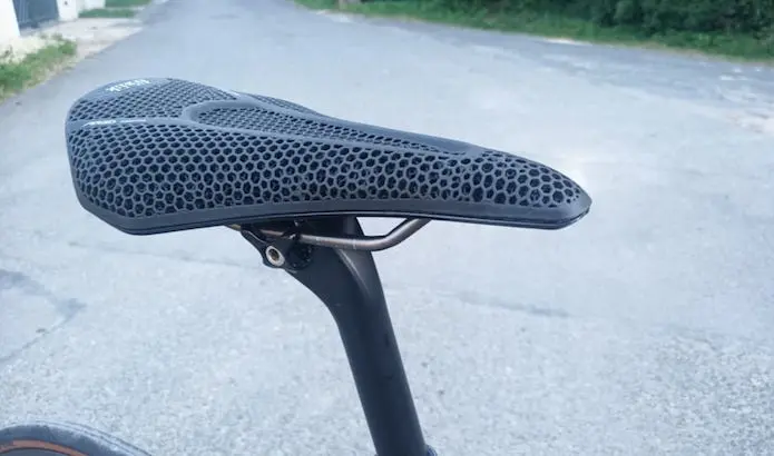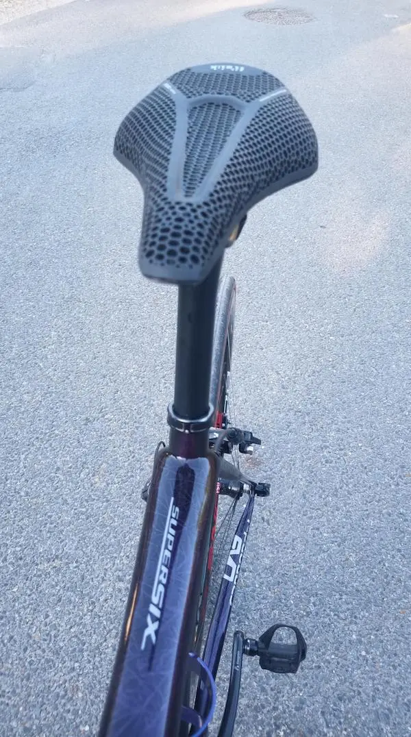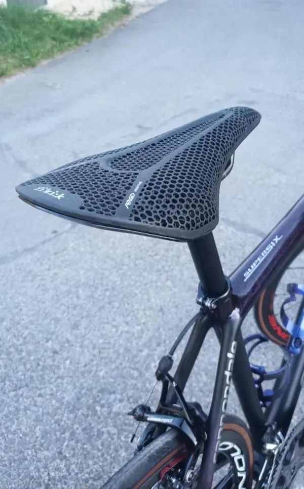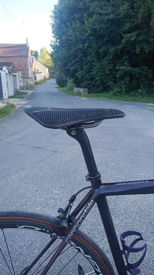 Dès la prise en main, on apprécie l’aspect sérieux, solide et original de cette selle avec cette impression 3D. L’ensemble fait très « haut de gamme » et donne un look plutôt classe au vélo. D’emblée, on peut ressentir un confort incroyable en s’asseyant dessus, car on s’enfonce dedans progressivement, un peu comme avec un matelas avec mémoire de forme. Une fois en place sur la selle, on ressent vraiment l’impression d’être calé encore plus que d’habitude (avec la Vento Argo), sans point dur. Les petites différences de pression droite/gauche que l’on peut parfois ressentir au niveau de l’assise se font oublier et on a le sentiment d’être mieux aligné sur la selle. On ne glisse pas sur la selle ce qui peut parfois être déroutant lorsqu’on a l’habitude du contraire, par exemple en se posant dessus un peu différemment selon les allures et les profils de route. En roulant, on ne ressent pas du tout l’aspect rugueux et alvéolé du revêtement.