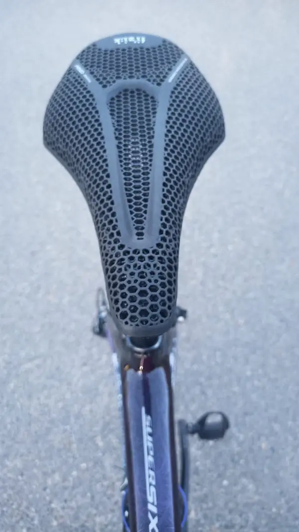 Si elle reprend les dimensions et la forme de la Vento Argo déjà testée, le modèle Adaptive se distingue donc par ce revêtement en nid d’abeille imprimé en 3D à densité variable, avec une fermeté plus sensible là où le soutien est essentiel, et plus de souplesse au niveau des tissus mous. La zone centrale, qui remplace l’évidement vu sur la Vento Argo, est par exemple totalement souple, et n’a pour effet que pour assurer de la stabilité au pédalage, grâce au contact rugueux avec le cuissard.