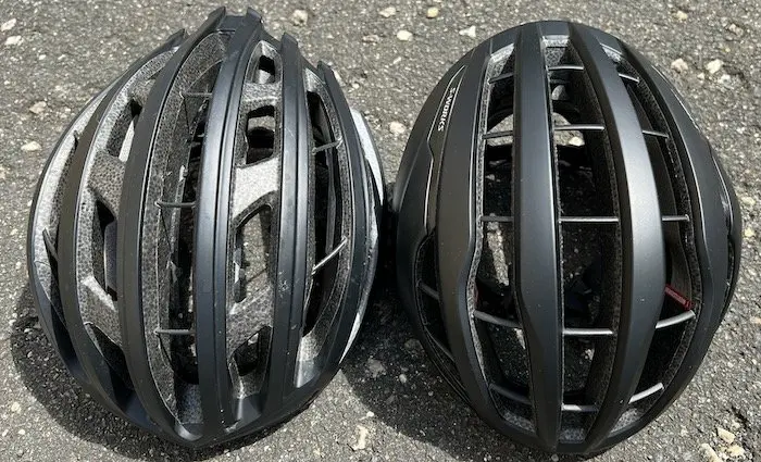 Le Prevail est nettement plus haut sur la tête que l’Evade, et forme une coque plus imposante. Entre le haut de la tête et la partie extérieure du casque, on mesure un peu plus de 4 cm, contre à peine 3 pour l’Evade. Ceci s’explique en grande partie par l’absence de jonctions en mousse entre les principaux canaux de ventilation sur l’avant. Cette taille extérieure était déjà de mise sur le Prevail de deuxième génération, mais ici on peut voir clairement que la profondeur des canaux est étudiée pour favoriser de grandes entrées d’air. Selon Specialized, la surface de ventilation serait ainsi augmentée de 24,5 % par rapport au précédent Prevail Vent. L’Evade 3 s’améliore lui aussi dans le domaine, mais avec un design qui favorise plus une forte ventilation en prenant de la vitesse. Le Prevail 3 quant à lui capte de l’air, même dans les ascensions abordées à faible allure, et c’est sensible dès les premières sorties sous un bon 30°C.
