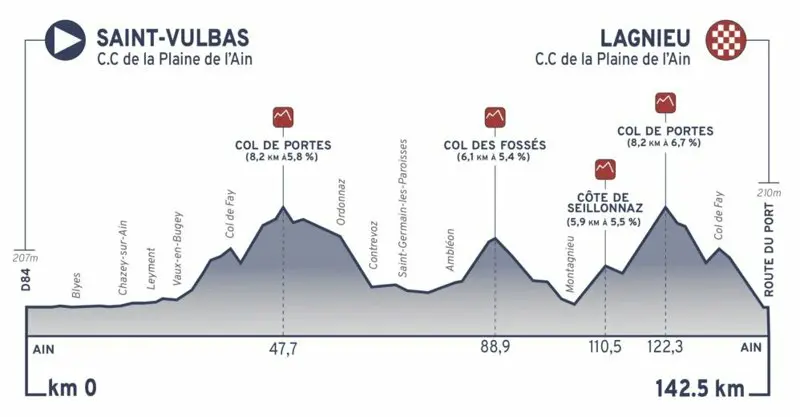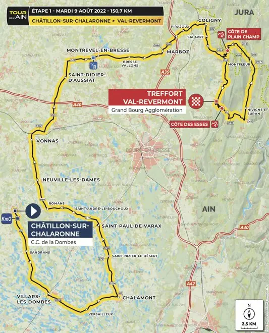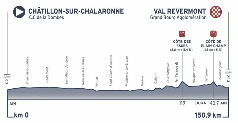 - Mardi 9 août : 1re étape / Châtillon-sur-Chalaronne – Val-Revermont (151 km, 1 210 D+, arrivée estimée vers 15h45)