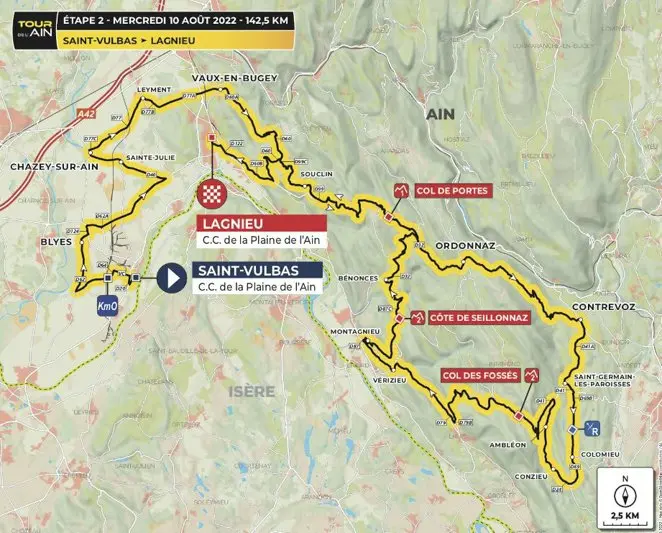 - Mercredi 10 août : 2e étape / Saint-Vulbas – Lagnieu (142,5 km, 2 679 D+, arrivée estimée vers 15h28)