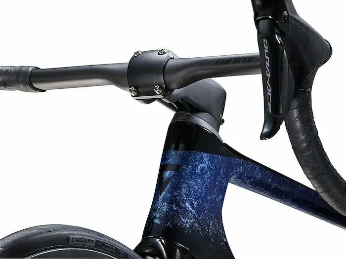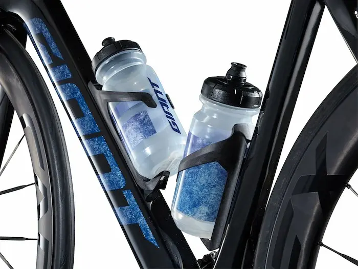 Les surfaces frontales, où l’aérodynamisme a le plus d’importance, présentent des lignes sculptées qui se transforment en ellipses tronquées pour minimiser la traînée. Selon l’approche globale de la conception aérodynamique, Giant a été jusqu’à créer deux porte-bidons différenciés : un pour le tube diagonal, un autre pour le tube de selle.