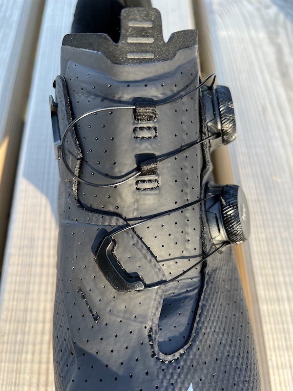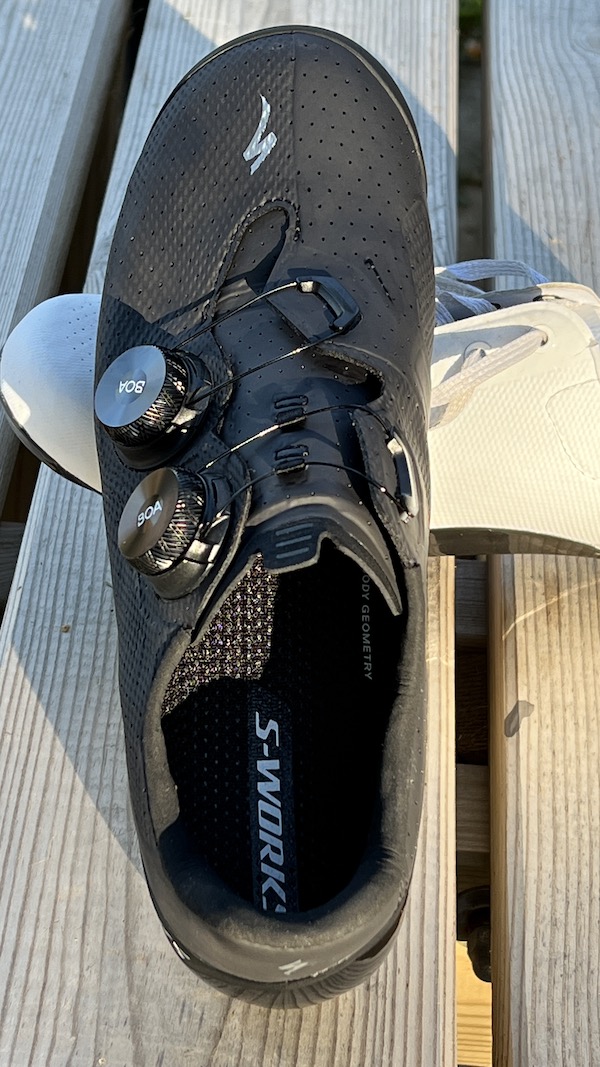 Le câble Boa du milieu du pied a été décalé vers le bas et incliné pour empêcher le soulèvement de la voûte plantaire. Ceci a permis de supprimer la bande velcro que l’on trouvait à l’avant des S-Works 7, mais la forme globale de l’enveloppement au moment du serrage permet surtout d’éliminer les points de pression et d’éviter de couper la circulation sanguine. La languette plus épaisse permet de supporter sans problème la tension des câbles Boa, jusqu’à pouvoir serrer très fort sans ressentir de gêne particulière. Avec l’absence de bande velcro et une partie avant plus large, l’avant de la chaussure parait plus rond que la version précédente, et il est effectivement plus large, mais sans être plus haut.