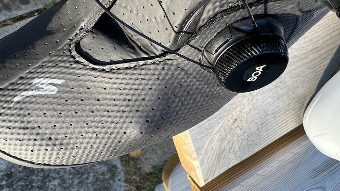 En ce qui concerne la structure de la chaussure, Specialized utilise désormais son propre matériau à la place du Dyneema des modèles précédents. Un matériau légèrement plus souple, qui se superpose plus facilement et qui créé moins de plis au moment du serrage. Ce matériau est également plus respirant, et il est renforcé au niveau des points d’ancrage des molettes Boa, et du côté intérieur de la zone des orteils. Sur le reste de la chaussure, il offre un peu de souplesse, de manière à créer moins de points durs ou de pressions sur les petites irrégularités du pied.