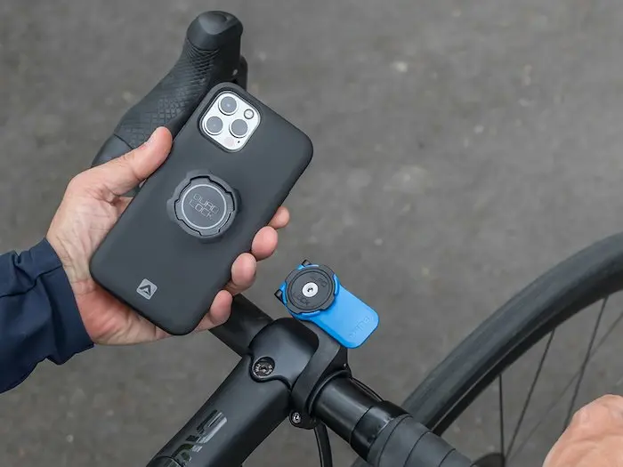 Les smartphones peuvent aussi servir de compteur GPS à vélo, avec différentes applications gratuites. Quad Lock propose des fixations pour plusieurs types de téléphone.