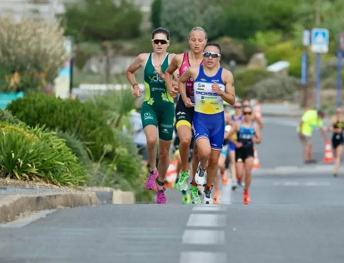 Louis Vitiello parvient malgré tout à s’élancer le premier sur le parcours pédestre, constitué de deux boucles de 2,5 km. Le Montois est très vite rejoint par un trio : son coéquipier Léo Bergère, Jelle Geens et le Britannique Barclay Izzard (Poissy Triathlon).