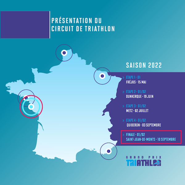 Après la belle réussite de l’édition 2021, la Fédération Française de Triathlon renouvelle sa confiance au club de Saint-Jean-de-Monts Vendée Triathlon Athlétisme, pour l’organisation de la finale des Grands Prix de Triathlon dans les 2 premières divisions ainsi que du Championnat de France Paratriathlon. Il est vrai que la commune est à la fois labellisée « Ville sportive 4 flammes », pour son dynamisme sportif et associatif (36 associations sportives), mais également, la ville élue la plus cyclable de France dans sa catégorie (ville < 10000 habitants) par la Fédération des Usagers de la Bicyclette (FUB). Sans oublier son label « Terre de Jeux Paris 2024 » pour faire vivre les JO à tous et son soutien aux athlètes de haut niveau. D’ailleurs Saint-Jean-de-Monts a passé une convention FFA pour être le camp de base l’équipe de France du Marathon français Le club organisateur est rompu aux grandes organisations avec le Trail des Pays des Monts fin février, mais surtout avec la reprise de son incontournable Triathlon qui -après 2 années compliquées à cause de la crise sanitaire- a pu de nouveau se dérouler à la fin du mois de juin pour la 37e fois ! Le millier de participants et l’engouement populaire sur cet événement présage une mobilisation encore plus grande pour l’événement phare du Triathlon Français en 2022.