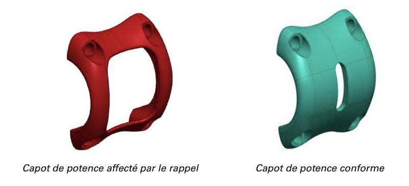 Le moyen le plus simple de déterminer si un vélo ou une potence vendue après ces dates sont équipé(e)s du capot défectueux est de procéder à une inspection visuelle. Le capot de potence représenté en rouge ci-dessous est la pièce à changer, tandis que le capot représenté en bleu/vert ci-dessous correspond à la pièce conforme. (Le capot de potence présentant le plus de surface est celui qui est correct).