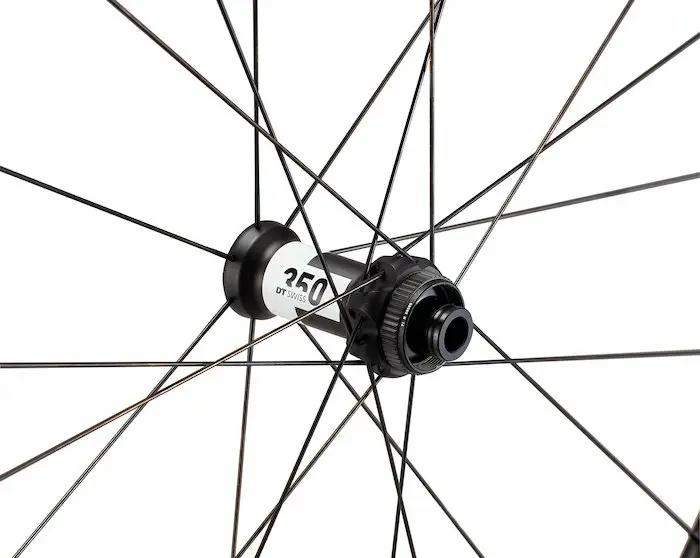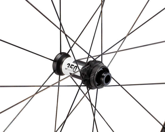 Rayons : DT Swiss Competition Race à tirage droit, Avant : 18 rayons, Radial/Croisement par 2 (2:1), côté transmission : 258 mm, côté opposé transmission : 270 mm, Arrière : 24 rayons, Croisement par (1:1), côté transmission : 256 mm, côté opposé transmission : 260 mm