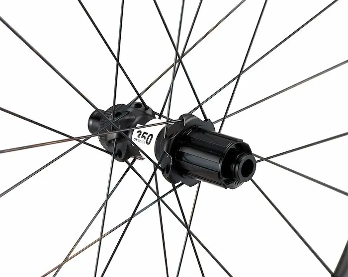 Rayons : DT Swiss Competition Race à tirage droit, Avant : 18 rayons, Radial/Croisement par 2 (2:1), côté transmission : 258 mm, côté opposé transmission : 270 mm, Arrière : 24 rayons, Croisement par (1:1), côté transmission : 256 mm, côté opposé transmission : 260 mm