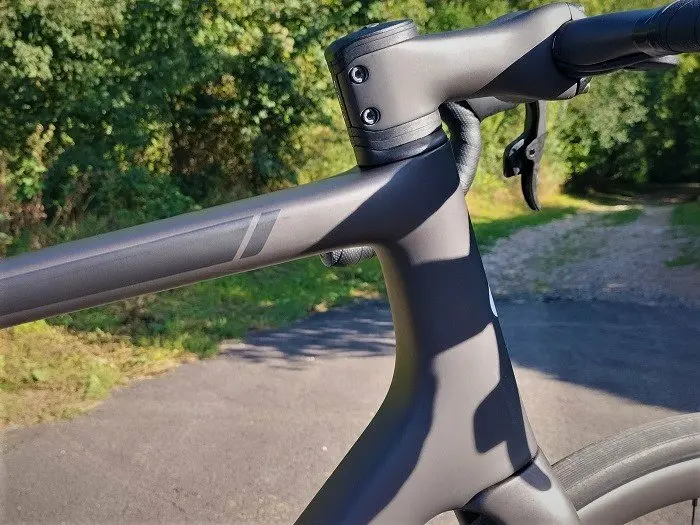 Dès les premiers tours de roues ou plus exactement, la première fois que le cycliste se met en danseuse sur ce Cervélo R5, c’est l’importante rigidité de la partie avant du vélo qui prédomine, notamment au niveau de la douille de direction. Cette rigidité réclame d’adapter son geste au moment de balancer le vélo de part et d’autre afin de retrouver la bonne coordination entre ce mouvement de balancier avec le haut du corps et la vitesse de rotation des pédales. Cependant, si la caractéristique reste particulièrement nette malgré la redéfinition du cadre sorti en 2021 par Cervélo, elle est à mettre au crédit des nombreuses qualités du vélo et participe à son rendement général.