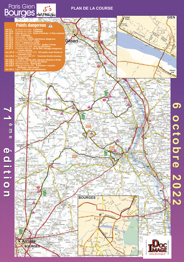 La 71e édition de Paris-Gien-Bourges se déroule ce jeudi 6 octobre 2022 sur un parcours de 198 km. 12 équipes World Tour sont au départ, et les favoris nombreux compte tenu des multiples scénarios possibles sur un parcours avec quelques difficultés dans le deuxième tiers de l’épreuve. Le vainqueur sortant Jordi Meeus (Bora-Hansgrohe), Arnaud Démare (Groupama-FDJ), Marc Sarreau (AG2R Citroën), Bryan Coquard (Cofidis), Arnaud De Lie (Lotto Soudal), Mads Pedersen (Trek-Segafredo), Fernando Gaviria (UAE Team Emirates), Jasper Philipsen (Alpecin-Deceuninck), Elia Viviani (Ineos) et Alexander Kristoff (Intermarché-Wanty) restent toutefois les sprinters les plus susceptibles de s’imposer. Retrouvez les détails du parcours et la liste des engagés de Paris-Bourges 2022.