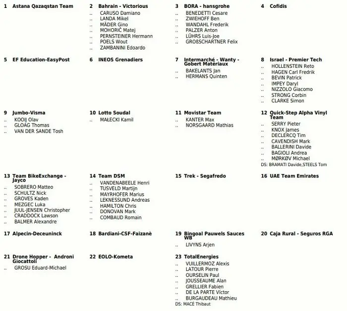 La liste des engagés du Tour du Piémont 2022 (au 05 octobre 2022)