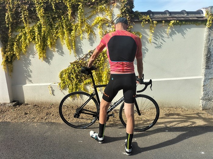 Quant au cuissard, c’est la taille M qui convenait le mieux, notamment en raison du caractère légèrement compressif des « jambes ». Là encore, l’effet sur la peau laisse augurer un bon confort de roulage – indépendamment du comportement de la peau de chamois – mais la finesse des bretelles surprend de manière peu convaincante a priori.