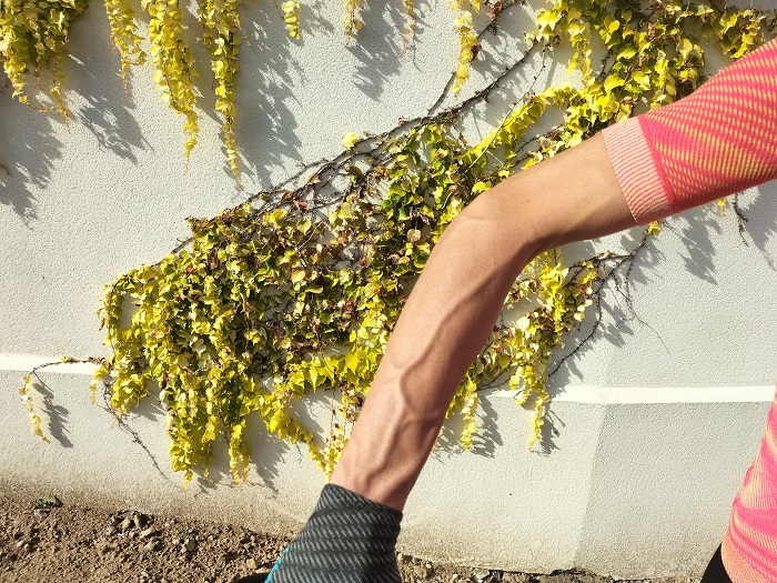 Ce qui étonne au déballage de la tenue est principalement le maillot Wave. Si le matériau ressemble à un tissu généralement rencontré avec les sous couches thermiques, UYN assure qu’il s’agit d’une structure spéciale, constituée de vagues tridimensionnelles permettant une meilleure régulation de la transpiration. Dans l’espace entre le haut des vagues, le tissu a une structure plus ouverte pour permettre l’échange entre l’air extérieur plus frais et la chaleur produite par le corps pendant l’activité. Au niveau du dos, ici encore le matériau employé n’est pas classique : il s’agit d’un tissu micro-perforé très fin qui permet une dissipation rapide de la chaleur excessive. A première vue, nous pourrions nous montrer craintifs vis à vis de la résistance aux coups de soleil tant les perforations semblent laisser passer la lumière. Mais la protection est garantie UV 30+. En poursuivant l’examen du produit, le faible nombre de coutures est à noter, une garantie de confort accru sur la peau car ce maillot est plutôt prévu pour être porté sans sous couche thermique.