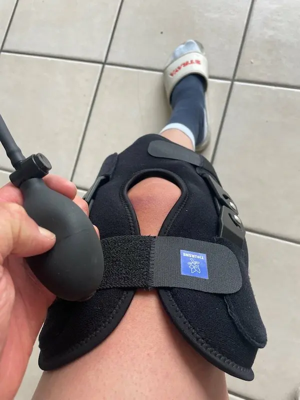 C’est là que la GenuStart Ice se différencie, grâce à une pompe manuelle, on exerce une compression adaptable en gonflant la genouillère afin d’immobiliser l’articulation. Tout est bien en place et l’on se sent bien immobilisé. Aussi bien au niveau des ligaments du genou qu’au niveau de la cuisse et du mollet.