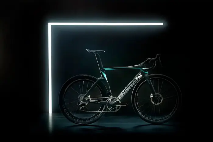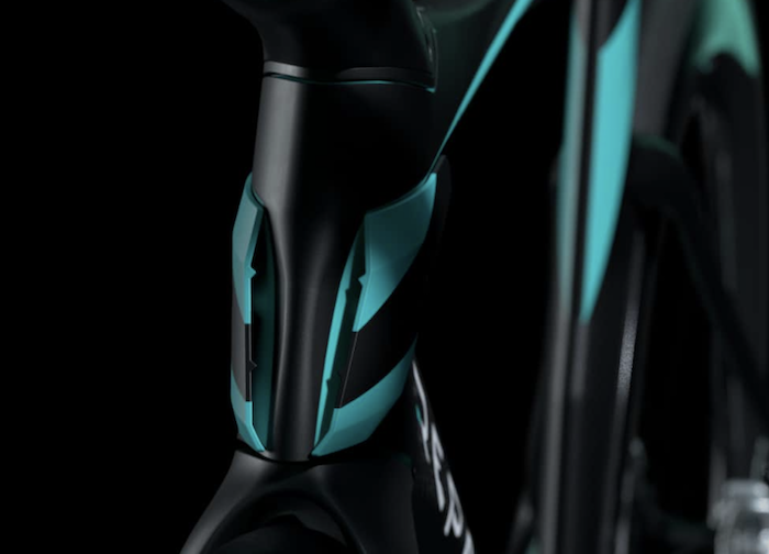 En plus de cet Air Deflector, l’Oltre 2023 bénéficie également d’un nouveau cockpit aérodynamique Reparto Corse, avec un canal d’air central pour créer des zones de flux d’air à basse pression, cette fois autour des jambes du cycliste. Des solutions qui rendent ce nouveau vélo particulièrement spectaculaire, et qui sont censées permettre d’économiser 17 watts à 50 km/h par rapport au précédent Oltre. Selon Bianchi, l’Oltre RC ferait gagner 45 secondes sur 40 km, en maintenant une puissance constante de 250 watts pendant une heure.