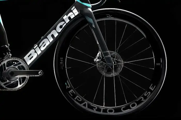 Avec l’Oltre, Bianchi lance également une nouvelle paire de roues SPB Tech, qui équipe le modèle RC : jantes de 50 mm à l’avant et 65 mm à l’arrière, avec une largeur interne de 21 mm, avec des roulements SKF en céramique. Le poids annoncé est de 1540 g.