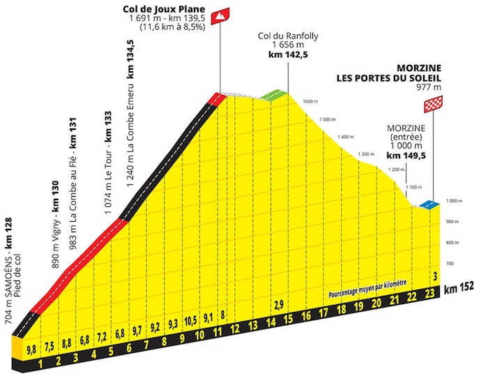 Après avoir bien négocié le dernier virage pour arriver dans Morzine, vous pourrez être fier d’avoir bouclé cette épreuve mythique. Même si pour cette Étape du Tour 2023 les cols ne sont pas spécialement de très haute altitude, l’épreuve n’en reste pas moins compliquée avec 4000 m de dénivelé en 140 km, au col du Ranfolly qui suit Joux Plane. Une épreuve qui impliquera une bonne gestion de ses forces mais qui se voudra plus accessible que l’édition 2022 et qui verra un vainqueur pas uniquement grimpeur avec des cols plus courts et moins hauts mais plus répétés donc gare à la bonne gestion de vos forces et à votre préparation : une bonne stratégie sera nécessaire.