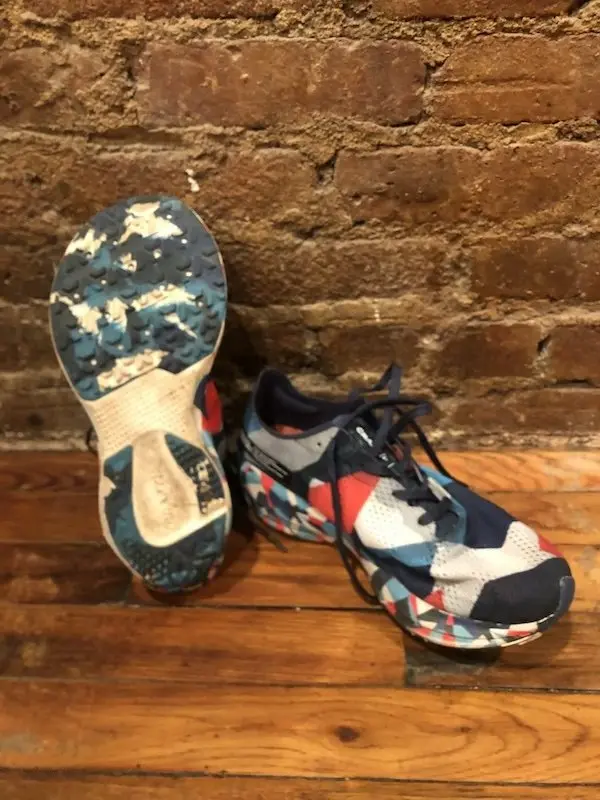 La semelle intermédiaire est composée de la mousse Ud Foam de la marque à base d’EVA et donc comme son nom l’indique d’une plaque carbone. Elle n’est ni molle ni ferme mais offre juste un équilibre entre les deux, avec un bon dosage entre la mousse et la plaque carbone. Aussi, la semelle en caoutchouc trois pièces avec crampons, s’adapte aussi bien aux allées de Manhattan qu’aux sentiers routiers ou modérés et d’ailleurs dans des conditions climatiques variables. Ce qui me frappe c’est l’adhérence et le pouvoir de traction. Je n’ai pas testé, mais ce serait intéressant de vérifier le comportement sur les pavés. Et encore mieux s’ils sont mouillés. Et concernant les mesures, je me suis rendu compte qu’on est à la limite du légal pour la World Athletics. En effet, 40 mm d’épaisseur au talon, 10 mm de drop et un poids de 288 g si je me fie à balance de cuisine.
