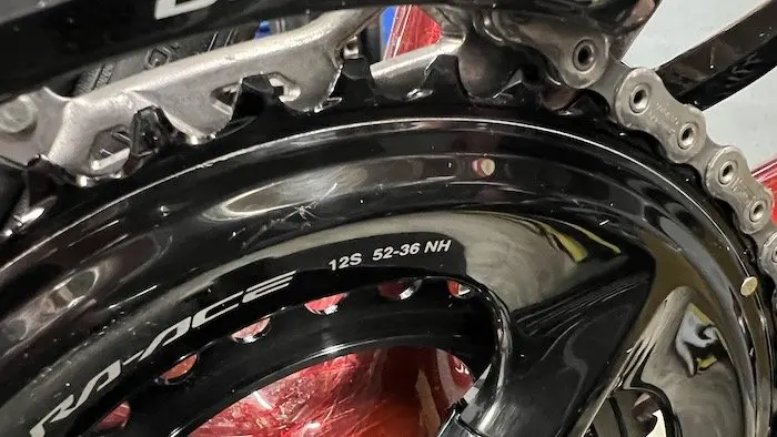 Si les plateaux ne montrent pas d’usure particulière et qu’ils semblent aptes à rouler encore longtemps, leur finition se montre très sensible aux rayures, au moment du remplacement de la chaîne, lors des transports du vélo ou en cas de réglage des dérailleurs. Et bien sûr en cas de saut de chaîne, chose qui n’arrive quasiment jamais fort heureusement. Les manivelles ont le même problème. En regardant de près, la magnifique anodisation noire est très fragile.