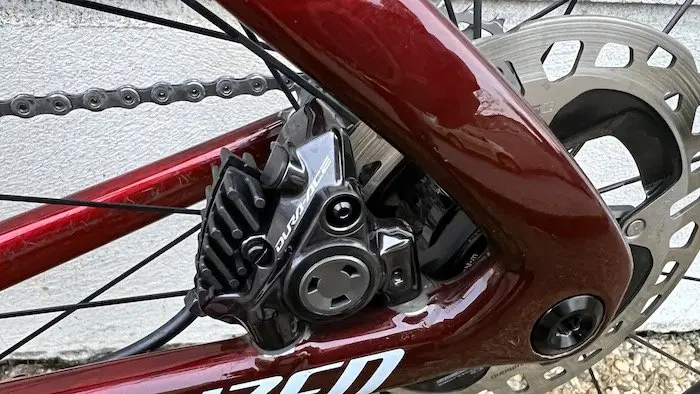 Et encore mieux : contrairement à la version précédente du Dura-Ace Di2 à disque, il n’a jamais été utile ici de régler les étriers de frein à chaque changement de roues. L’ancien système reste parfois pénible à régler pour éviter bruits ou frottements au niveau des freins, avec un très faible espace entre les plaquettes et le disque. Et le moindre changement de roues, s’il y a un infime écart au niveau du positionnement du disque, implique un réglage fastidieux des étriers. Avec le Dura-Ace version R9270, le problème est quasiment résolu, puisque Shimano a réussi à augmenter l’espace entre les plaquettes et le disque, sans modifier la course du levier de frein. C’est un énorme atout par rapport à l’ancienne version.