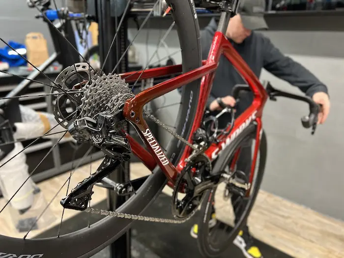 J’ai aussi l’habitude de faire un petit test sur pied d’atelier : je lance à la main la roue arrière en marche arrière. Le résultat n’est pas fluide comme il le devrait : léger ressaut de la chaîne. Sur le vélo de mon fils, un Origine avec DA 11v Méca, c’est ultra-fluide, et pourtant la transmission n’est pas neuve.